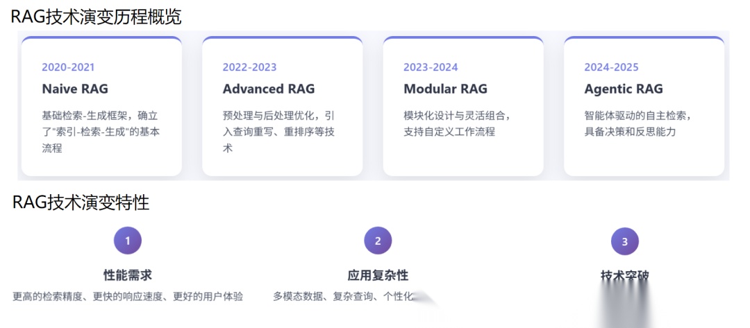 检索增强生成(RAG)技术的发展史,是一部不断挑战大型语言模型(LLM)局限性、追求系统级智能的演进史。RAG 的演变并非简单的功能叠加,而是对“如何高效、可靠地将外部知识融入 LLM 推理过程”这一核心问题的持续探索。我们可以将 RAG 的演进脉络划分为四个清晰的阶段:Naive RAG 确立基本范式,Advanced RAG 聚焦精细化优化,Modular RAG 追求架构灵活性,最终 Agentic RAG 实现自主决策与智能化。