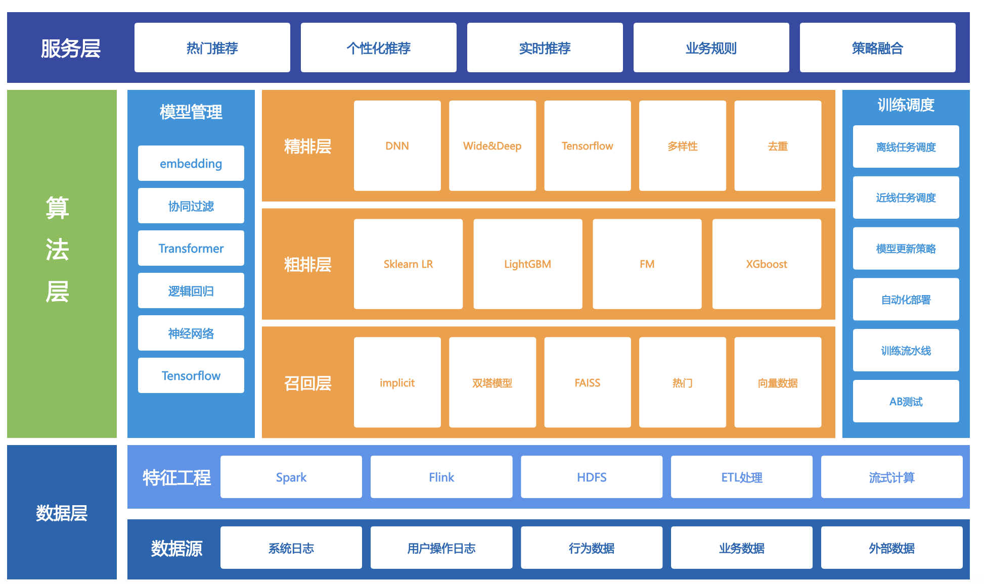 推荐系统的目的只有一个:把用户可能感兴趣的产品推荐给他们。推荐系统可以说是AI落地最成功的一个领域,它和我们的日常生活相关,我们每天刷短视频,新闻,逛pdd淘宝都会与他打交道。推荐系统是一个极具综合性的系统,涉及前端、后端、大数据、算法、机器学习等等技术,它没有固定的格式,针对不同的场景可以有灵活的搭配和设计。这里我把业界常见的推荐系统进行抽象,为了方便大家理解,做了一定的简化,形成了一个由下至上的三层系统架构,供大家学习和参考。