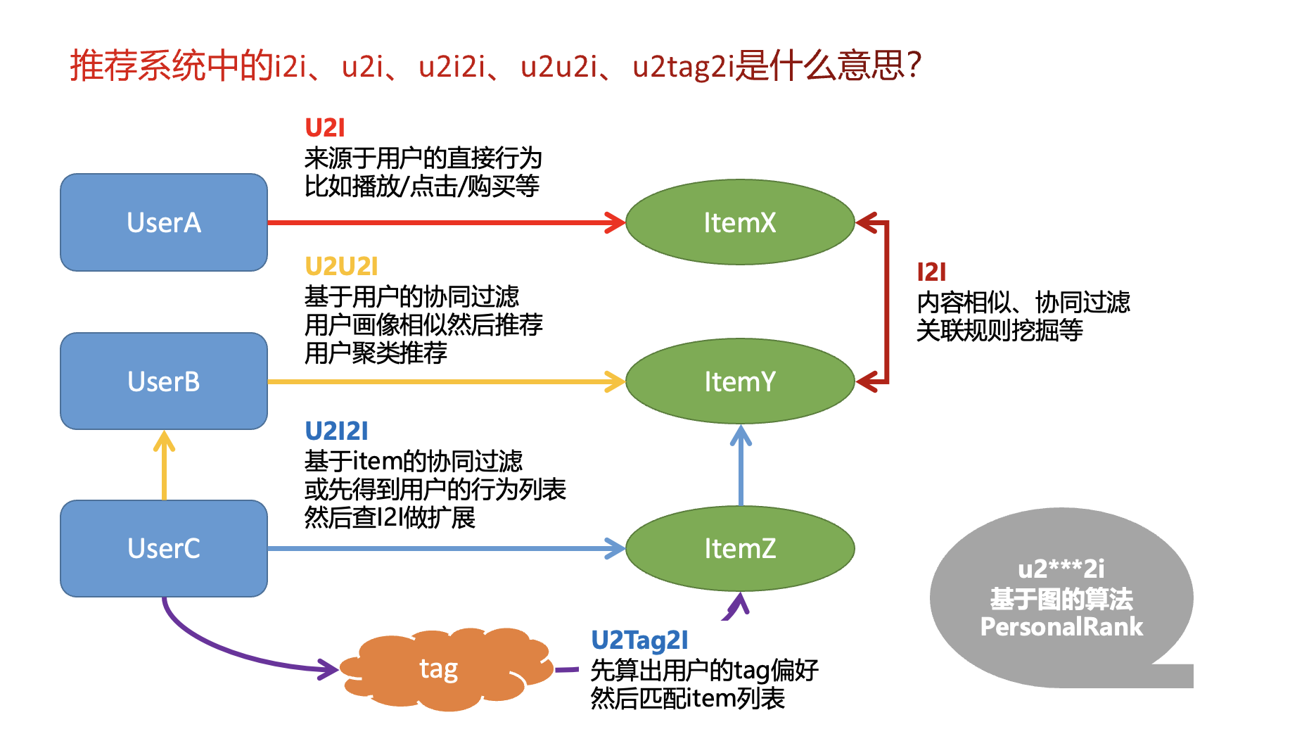 当然,从大海洋抽水到小水库所用到的水“管通”通常不止一条,多条“水管”一起放水,每条水管用一种算法,各自搬一批货,最后把各家的货合起来,再去重、过滤,就得到几百条候选。接下来给大家介绍一些常见的“水管”。