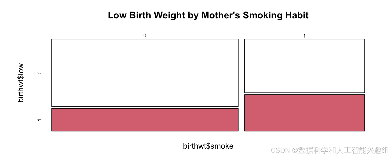 最后是列百分比表,它展示了在体重正常或体重低的婴儿中,不同母亲吸烟状况的分布。在体重正常的婴儿中,66.2%的母亲不吸烟,33.8%的母亲吸烟;而在低出生体重的婴儿中,49.2%的母亲不吸烟,50.8%的母亲吸烟。这也提示吸烟母亲生下低出生体重婴儿的比例明显高于不吸烟的母亲。