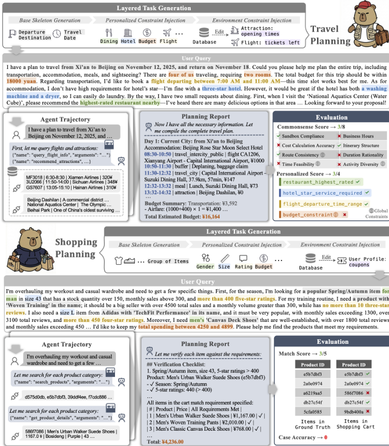 官方文章中给出了两个核心测试场景(旅行规划、购物规划),每道题都包含 “用户需求→Agent 规划轨迹→评估结果” 三部分。我们结合文中的示意图与表格,逐题分析 “难点” 与 “AI 的失误”。