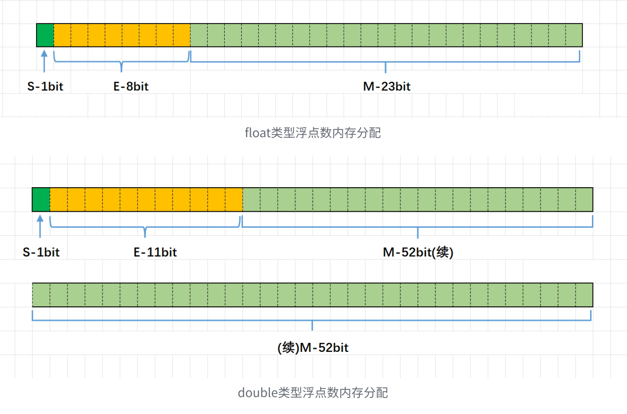 IEEE 754规定: 对于32位的浮点数(float),最⾼的1位存储符号位S,接着的8位存储指数E,剩下的23位存储有效数字 M