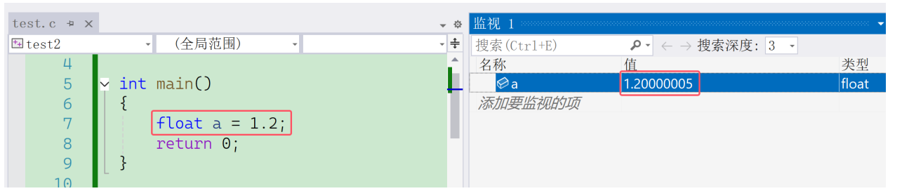 这样的浮点数存储⽅式很巧妙,但是我们也要注意到有的浮点数是有可能⽆法精确保存的。⽐如:1.2, 我们可以在VS上调试看⼀下,我们发现会有些许误差。