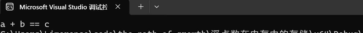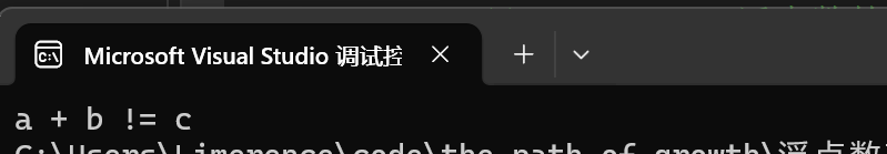 return 0;如果纯靠数学思维来思考,那我们自然认为a+b == c,但是通过上面的学习,我们发现有些浮点数其实并不能准确的表示,如图所以程序中的打印结果也并不是,a+b == c而是所以需要换一个判断标准,我们一般会规定一个误差标准,当误差小于这个标准是,我们认为相等,否则,不相等如int main()else= c");return 0;我们给出了一个判断标准,那么得到的程序运行结果为以上