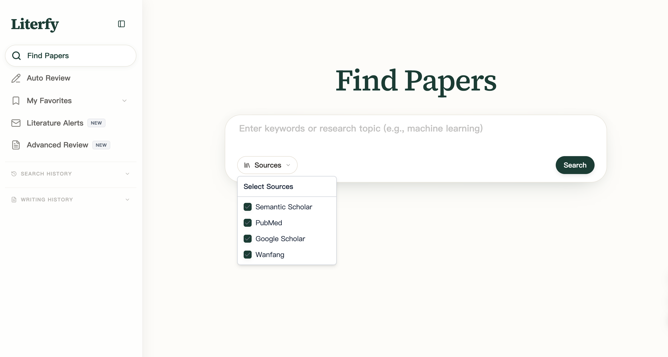 Literfy 解决方案: 它是目前极少数实现一站式论文检索的平台,整合了 Google Scholar、PubMed、Semantic Scholar 以及国内的 万方数据 (Wanfang)。