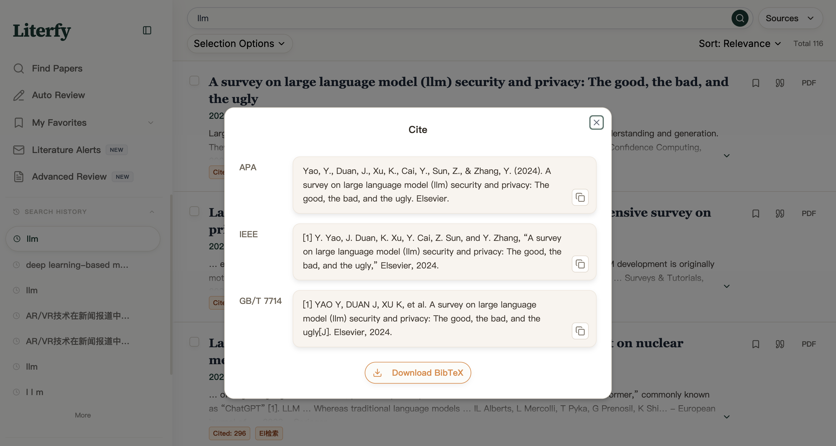 Literfy 解决方案: Paper Subscriptions(论文订阅) + Export References(导出引用)。