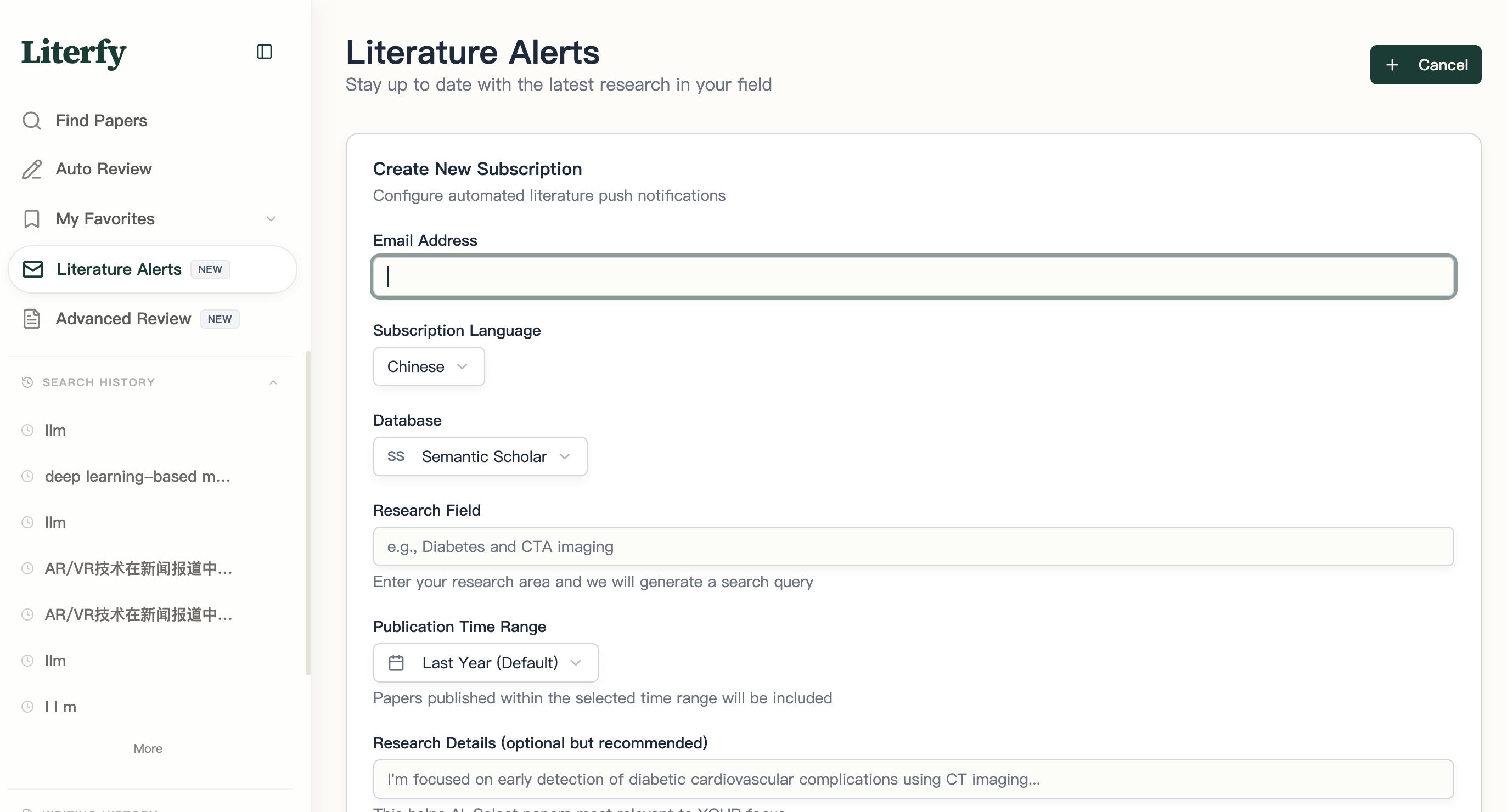 自动驾驶: 订阅某一研究领域,Literfy 会定时向你邮箱发送相关新论文,不用再反复搜索。