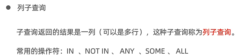 (2)列子查询:子查询返回结果是一列