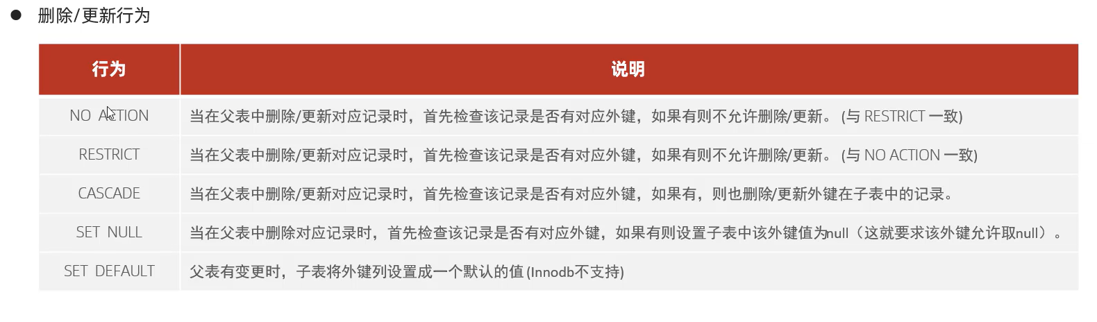 - CASCADE:父表记录删除时,自动删除子表关联记录。