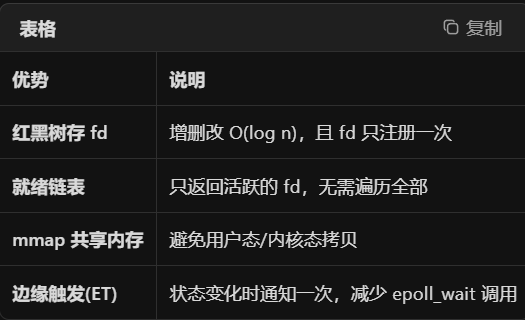 select的fd上限是1024,每次调用都需要拷贝整个fd_set到内核,遍历所有的fd;poll只是在select的基础上取消了fd的上限;epoll分为三个步骤:注册阶段(fd写入内核),事件就绪(内核回调,将就绪fd放入链表返回),epoll_wait(直接返回就绪的链表)