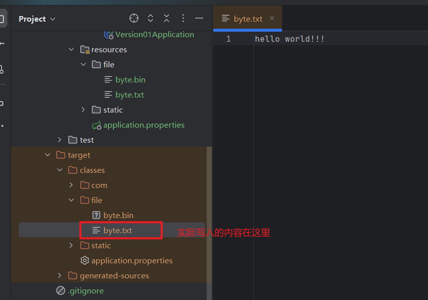 在使用output流时,如果项目是Maven项目,需要注意src/main是源码目录,当程序编译后,会将resource目录下面的文件复制到target目录下面。