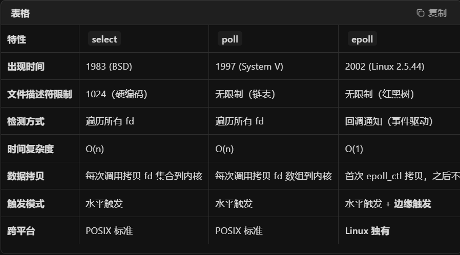 select和poll都是轮询O(n),epoll是事件驱动O(1);select有1024限制,poll和epoll没有限制,epoll支持ET模式。