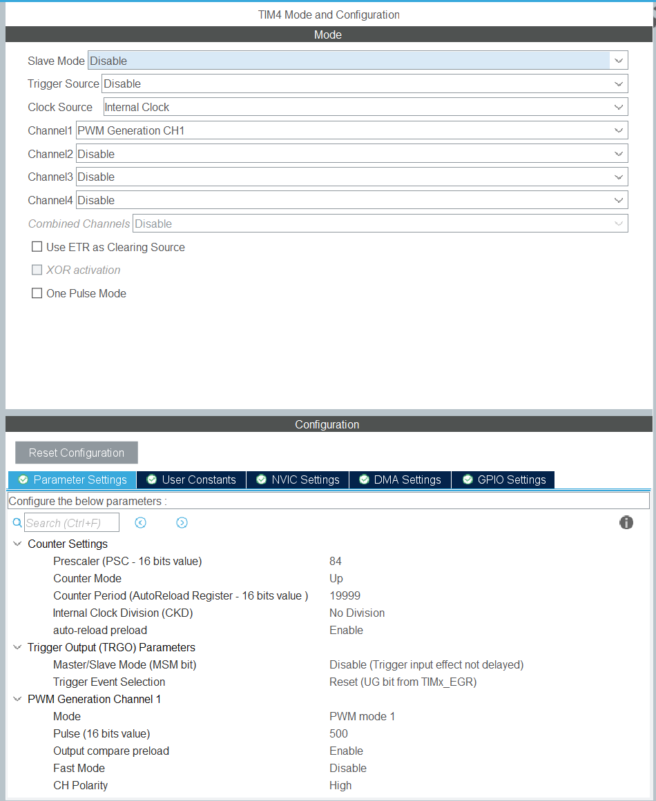 在STM32里面,PWM也算是TIMER的一种。所以要在TIM里面配置,我用的TIM4。控制的SG90舵机。此时要确保APB1的时钟是84MHz。
