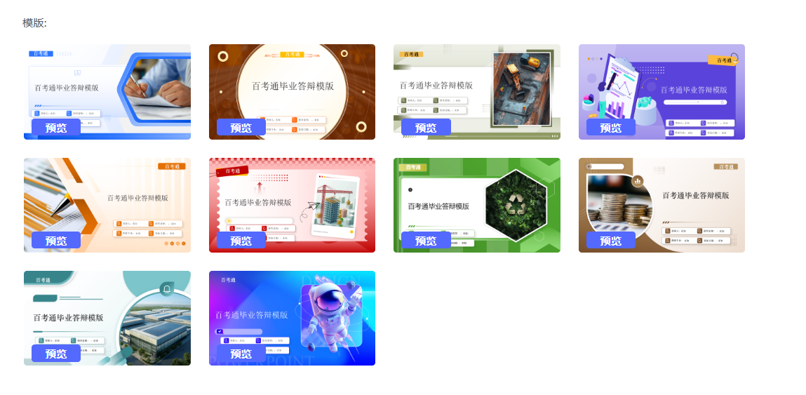 百考通AI内置了经过分类整理的模板库,涵盖学术、商务、教育、技术分享等多个类别,风格也从简约清新到专业稳重不一而足。系统会根据你选择的场景,推荐最适合的模板选项。比如选择“学术答辩”,你会看到偏正式、多图表、强调层级清晰的模板;选择“产品发布会”,则会推荐视觉冲击力强、动画丰富的样式。