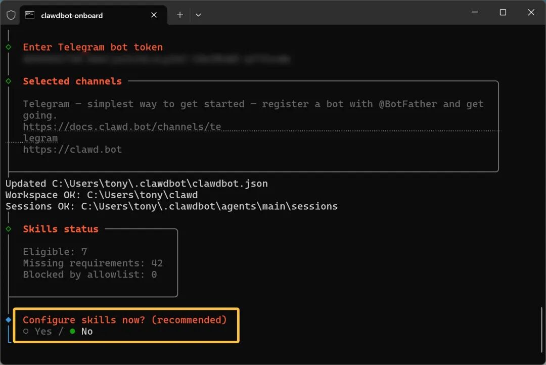 技能是很有用,但是为了减少复杂度,我们先不启用。直接选择 No,回车。