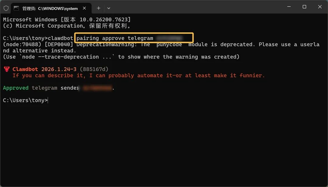 大概意思就是,权限受限,需要运行黄色框中的命令,才可以使用这个 TG 进行对话。
