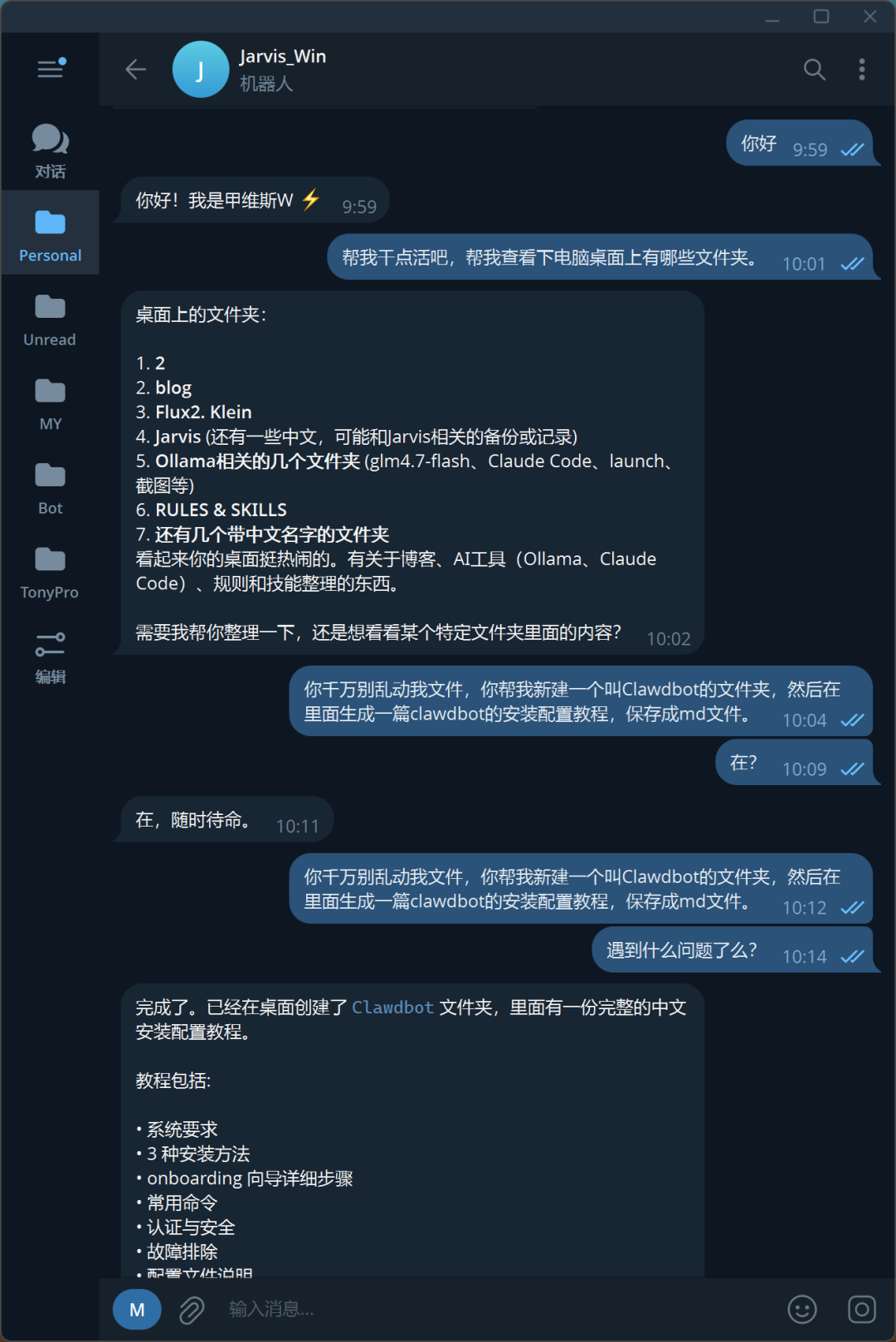总的来说,配置并不是很难。核心就是要设置大模型 API 和对话通道。经过简单测试,对于系统操作类的任务,GLM4.7 完全可以胜任。我的年卡终于有用处了。