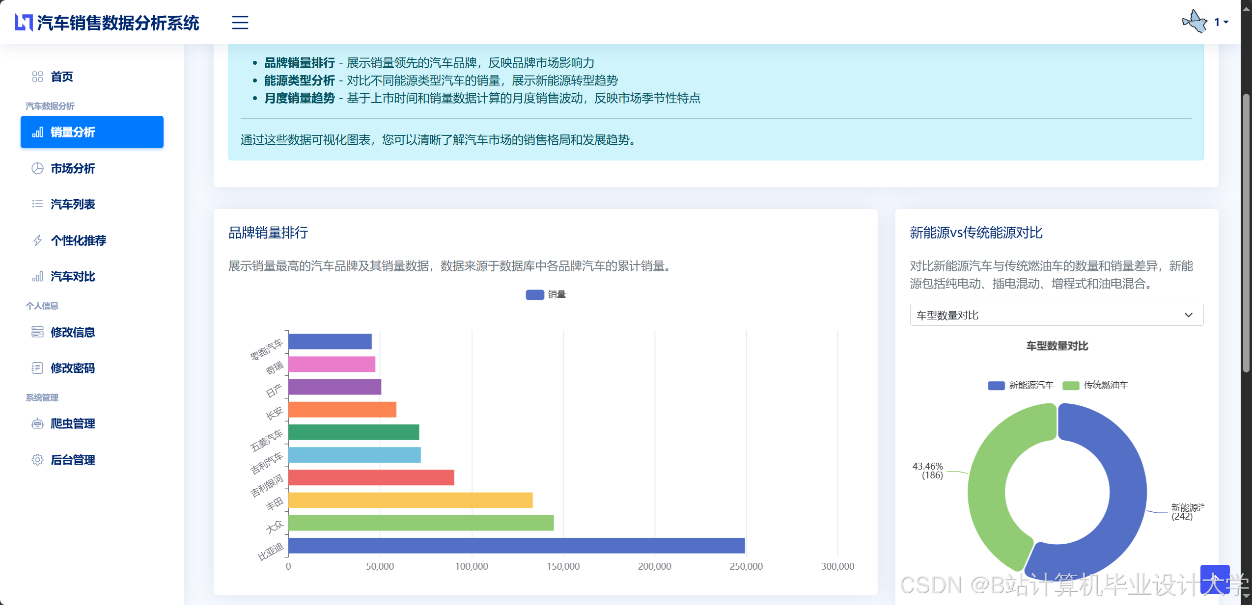 本文提出基于Django框架与大模型技术的新能源汽车销量分析可视化系统,通过多源数据集成、深度学习模型训练与交互式可视化技术,实现销量预测与市场分析。系统采用分层架构设计,整合结构化销售数据、用户评论等非结构化数据,运用BERT、GPT等大模型进行情感分析与语义理解,结合LSTM神经网络实现销量预测。实验表明,该系统在预测准确率(MAE降至0.78)、实时响应速度(80ms)和用户决策效率(缩短4