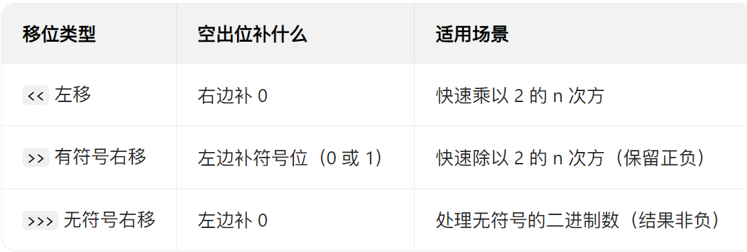 - 有符号右移补符号位(正数补 0,负数补 1)。