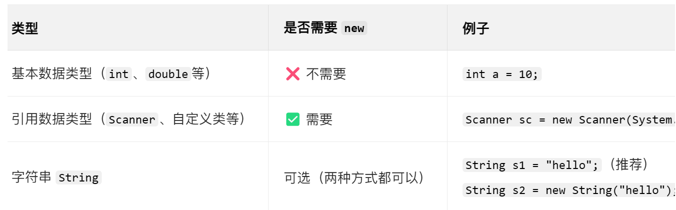 Scanner是引用数据类型(它是 Java 提供的一个类),所以需要用new来创建对象。Scanner sc:声明一个Scanner类型的变量sc(相当于准备一个 “盒子”)。new Scanner(System.in):调用Scanner的构造方法,创建一个Scanner对象(相当于造一个 “扫描器工具”)。=:把这个新创建的对象的内存地址,赋值给变量sc(相当于把 “工具” 放进 “盒子” 里)。