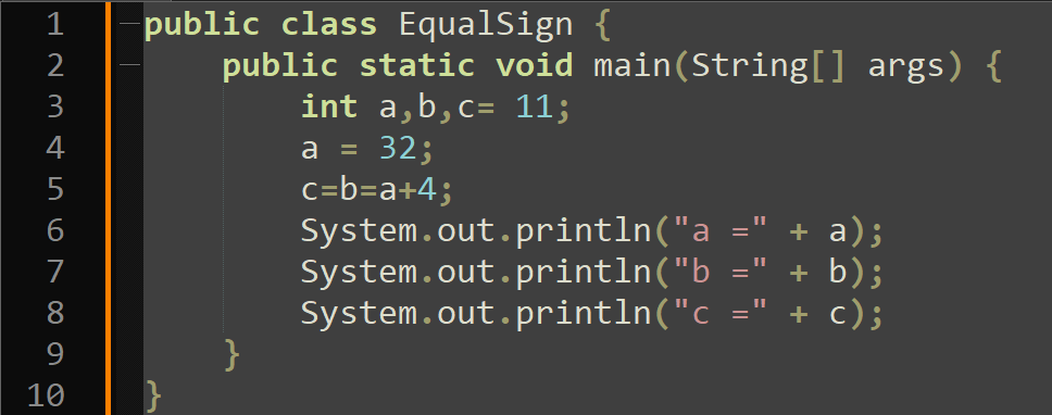 public:访问修饰符,意思是 “这个类可以被其他类访问”(零基础先记:写类时常用public开头)。class:Java 里定义 “类” 的关键字,类是 Java 程序的基本单位(可以理解成一个 “代码盒子”,装着要执行的逻辑)。EqualSign:类的名字(自定义的,这里叫 “等号”,因为代码讲赋值运算),类名要和文件名一致(比如文件叫EqualSign.java)。