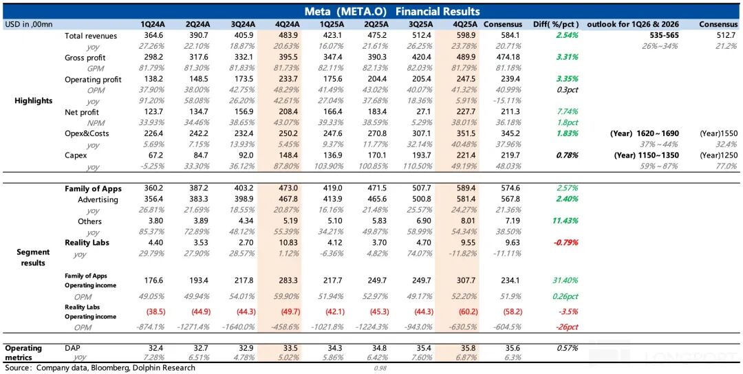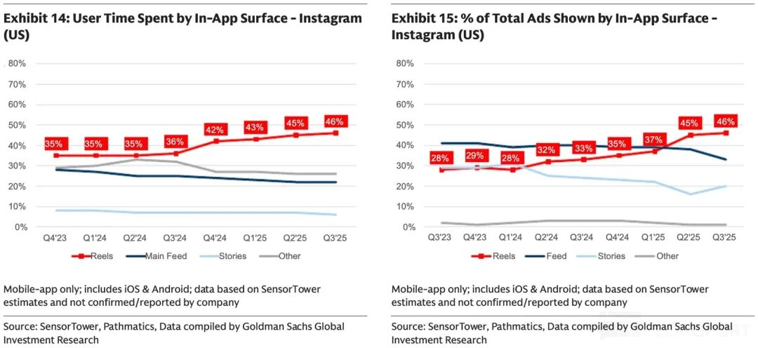 Meta公布的2025年第四季度数据非常亮眼。单看四季度,Meta的收入达到了599亿美元,同比增长24%(汇率中性下为23%),显著超过了市场预期。这种高增长主要得益于其广告业务的强劲表现,尤其是短视频内容Reels的爆发。数据显示,四季度广告展示量增长了18%,而单价也增长了6%。Reels等短视频内容极大地增加了用户的粘性和时长,进而拉高了广告库存和转化效率。