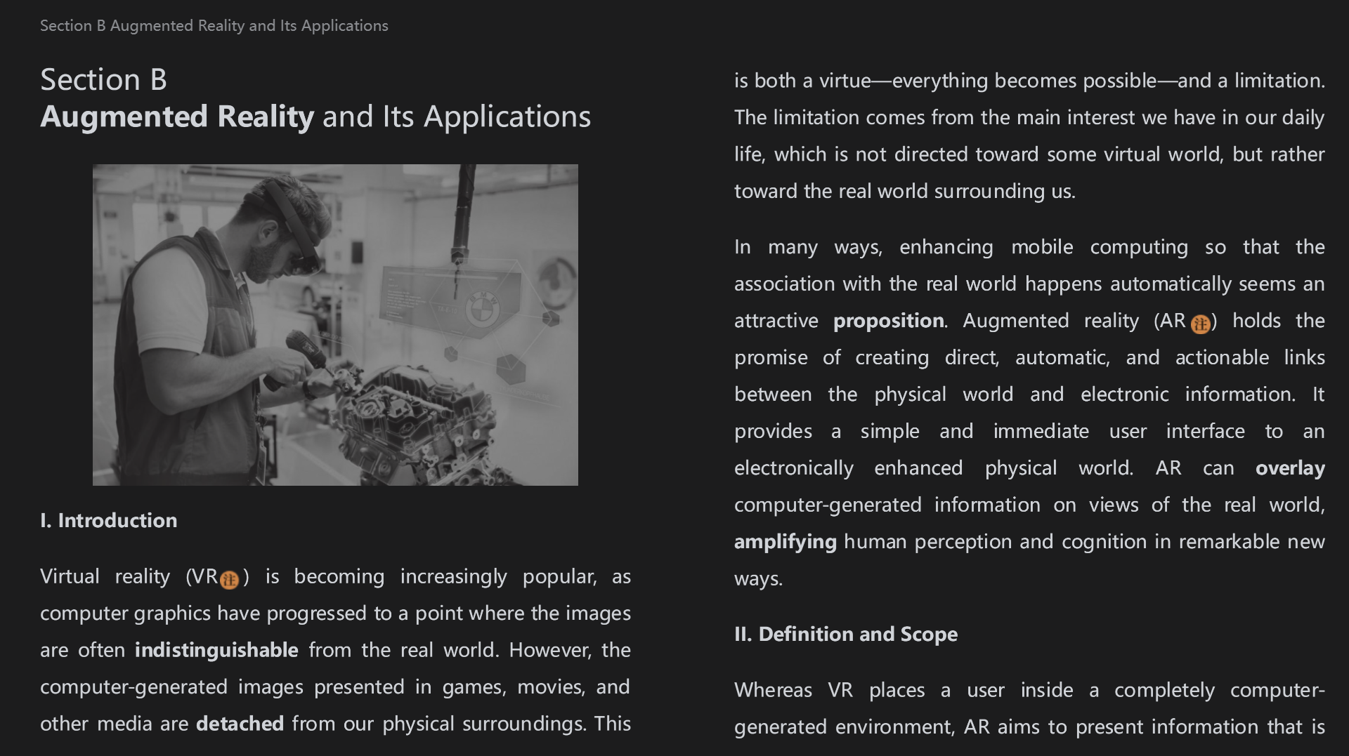 到达这个连接是一个宏伟的目标,这个目标要利用计算机科学很多领域的知识,然而这会导致对AR到底是什么的误解。例如,很多人将虚拟和现实元素的视觉联系与例如侏罗纪公园和化身这种电影里的特殊效果联系起来。虽然用在电影里的计算机图形技术也可以应用在AR上,但是电影缺乏AR交互性这个关键方面。为了避免这种困惑,我们需要为讨论的主题设置一个范围。换句话说,我们需要回答一个关键问题:什么是AR?