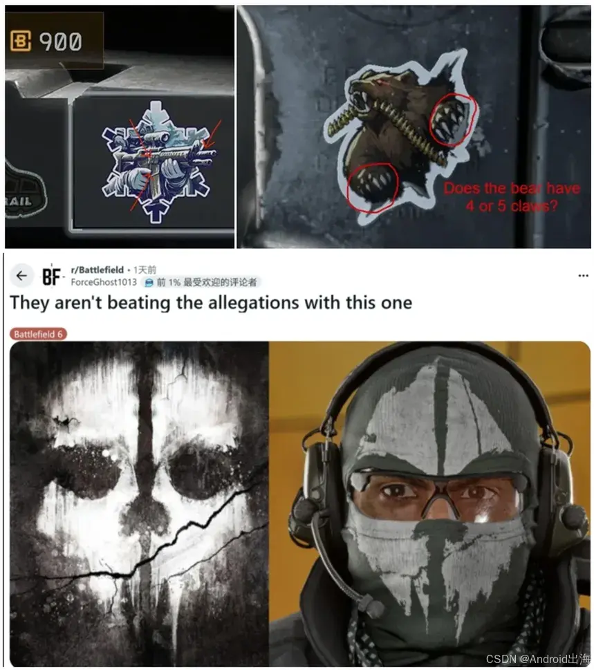 《战地风云6》也是此类问题的重灾区,用于售卖的道具、武器贴纸、角色皮肤等都受到过指摘,其中2025年年底的一款新皮肤被用户扒出,可能是用了十几年前发售的《使命召唤10》的素材作为AI提示词或底图,该游戏偏偏还在发售前曾承诺不会使用AI。