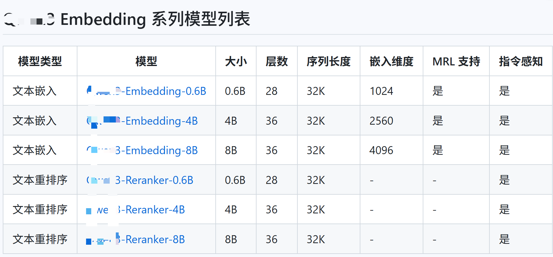 文本嵌入模型用于将文本转换为向量,这些向量可以用于计算文本之间的相似度。表格中提供了三种规模的模型:0.6B、4B和8B。