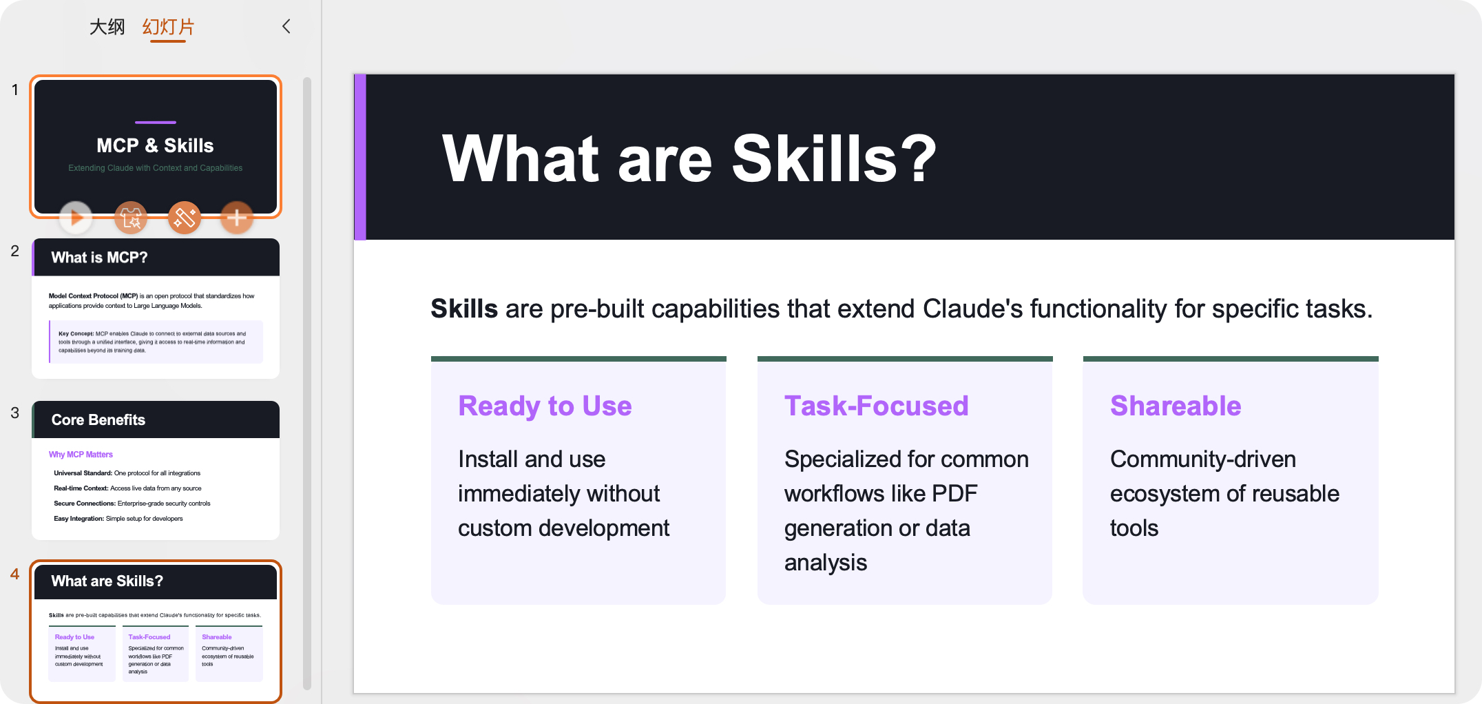 Skills是 Claude 提供的一种模块化、可复用的能力扩展机制,用于将某一领域的专业知识、标准流程和操作规范封装成可被模型自动理解和执行的能力单元。