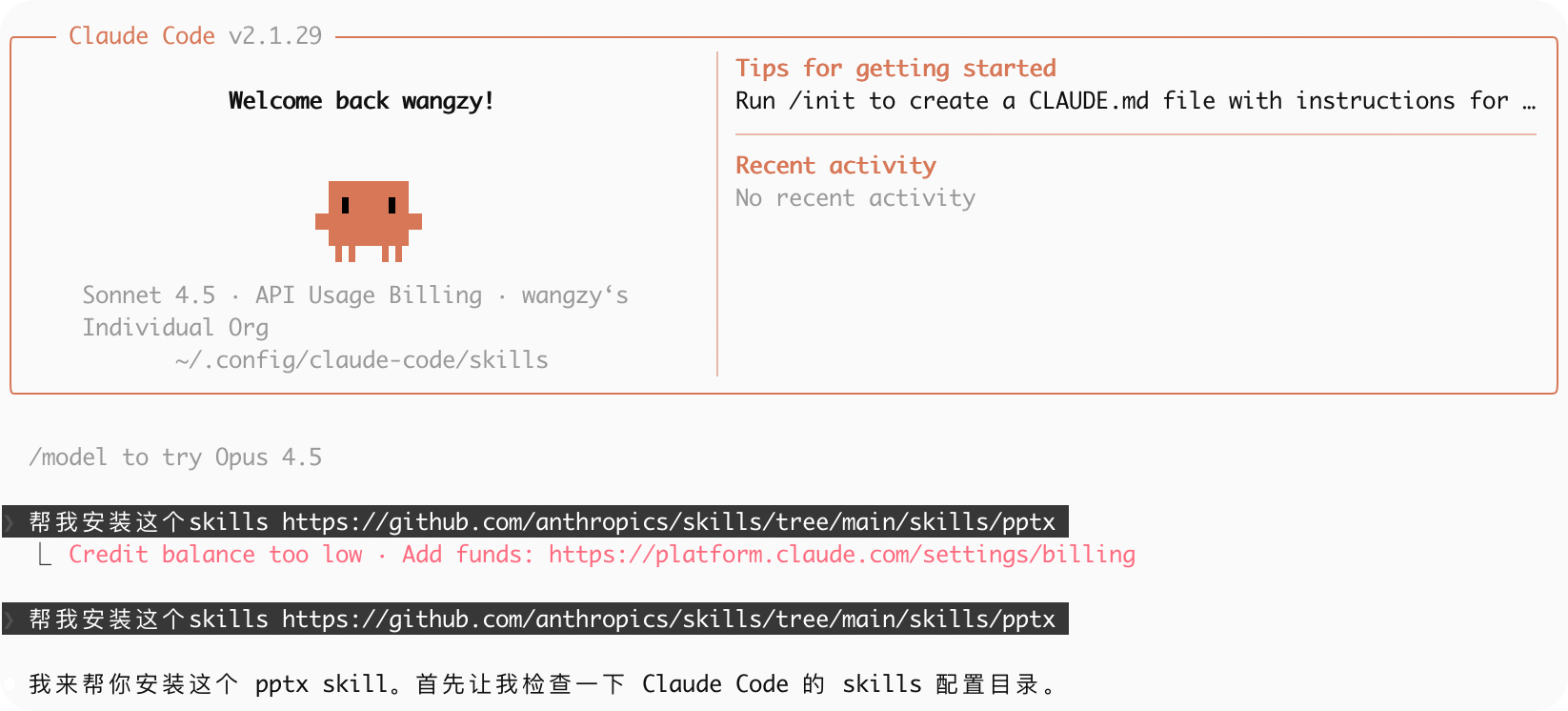 上一次参加腾讯架构师同盟的沙龙,腾讯codebuddy的林强老师就说到了,现在大模型能力没有普及到生活中的各个场景,很大一个原因就是token的成本太高,如下截图仅仅是我用claude code去安装pptx skills时以及一些依赖安装,到最后做一个简单的5页ppt文档的token消耗情况,由于当前token的成本还是太高,所以对个人的一些不重要的任务还是不太适合用ai的方式来解决。