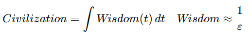 - Civilizational Collapse: Civilization=∫Wisdom(t)dt, where Wisdom∼e−1 (Civilization is the integral of wisdom over time, with wisdom inversely proportional to cognitive error)
