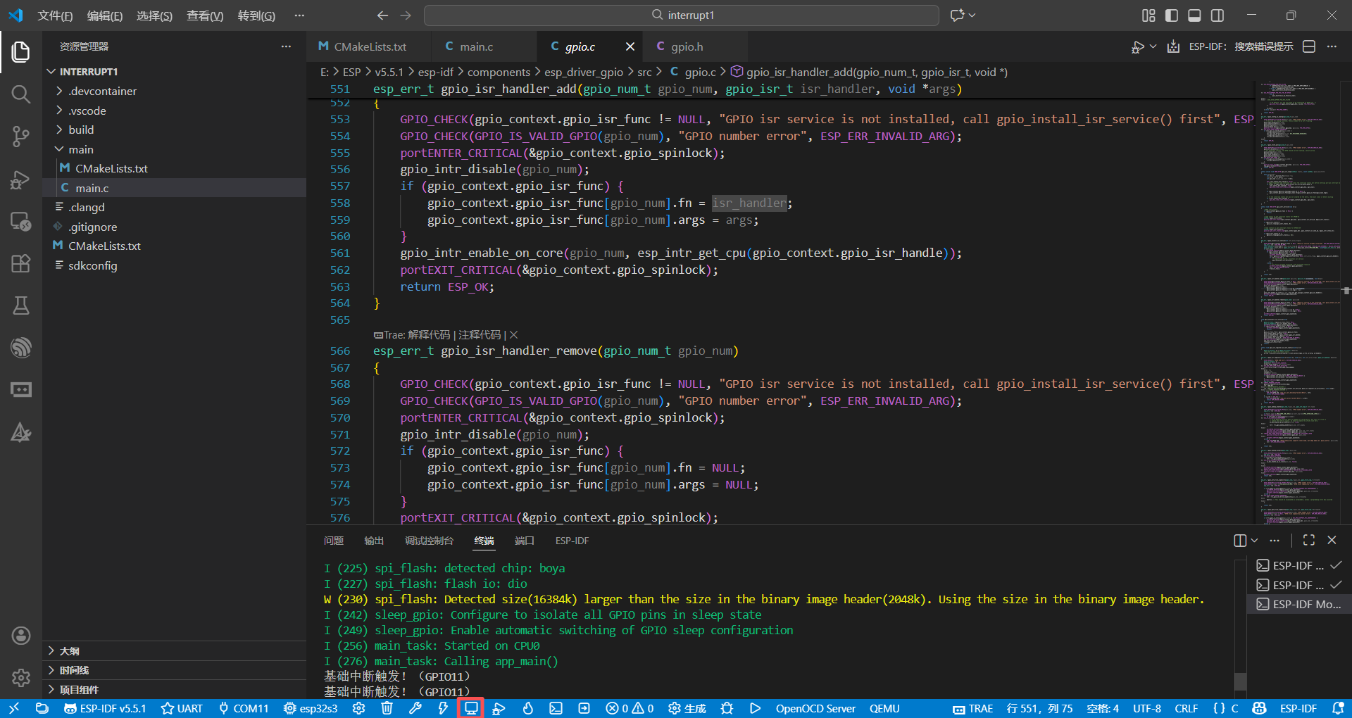 app_main里的循环、普通任务)。 - 突然,你的办公电话响了(对应:硬件 / 软件触发了中断,比如 ESP32 中 GPIO11 电平下降、串口收到数据)。