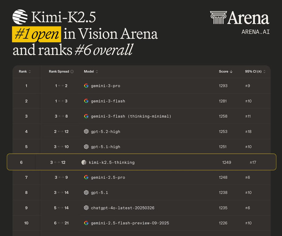 一方面,Kimi K2.5的性能依旧在线。抛开在OpenRouter上的高调用量不谈,在多个全球权威基准测试中也得到了量化验证。比如,在更具技术针对性的LMArena评测中,它在代码与视觉双关键维度位列开源第一,总榜前三,仅次于Gemini和GPT模型。而在Artificial Analysis的综合评估中则是位列开源第一、总榜第五,凸显了其卓越的参数效率与成本优势。