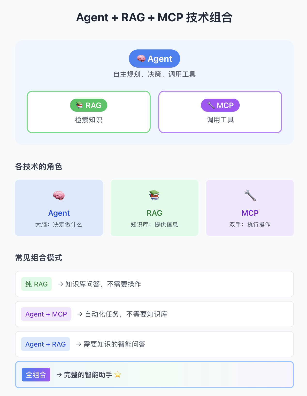 | Agent 模式 | 用户问 → AI 思考用什么工具 → 调用工具 → 根据结果回答 |