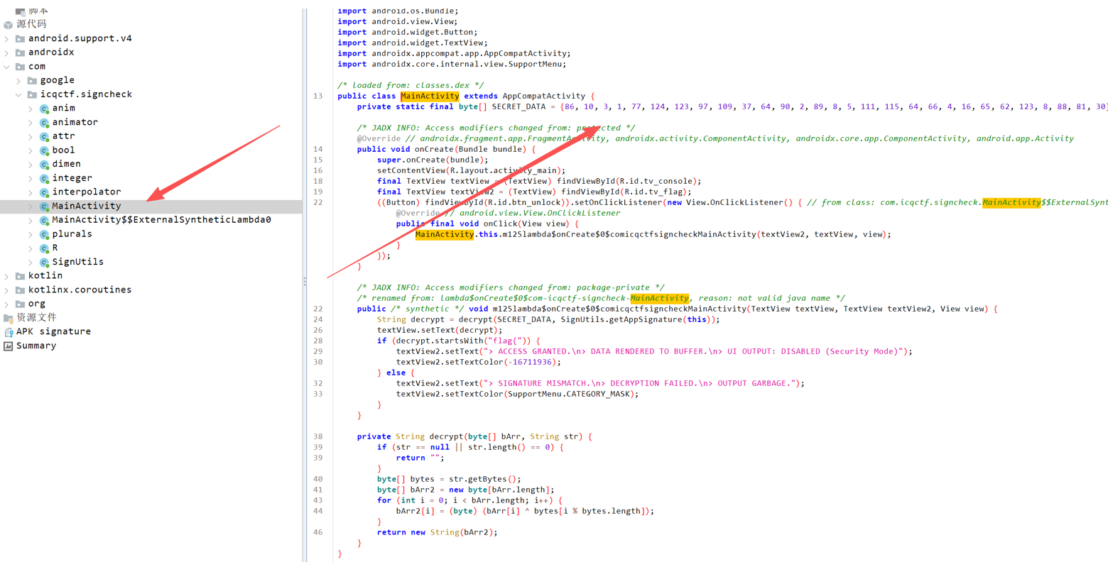 decrypt(SECRET_DATA, SignUtils.getAppSignature(this))是 异或 XOR 解密,key 是getAppSignature()返回的字符串字节循环使用。 -