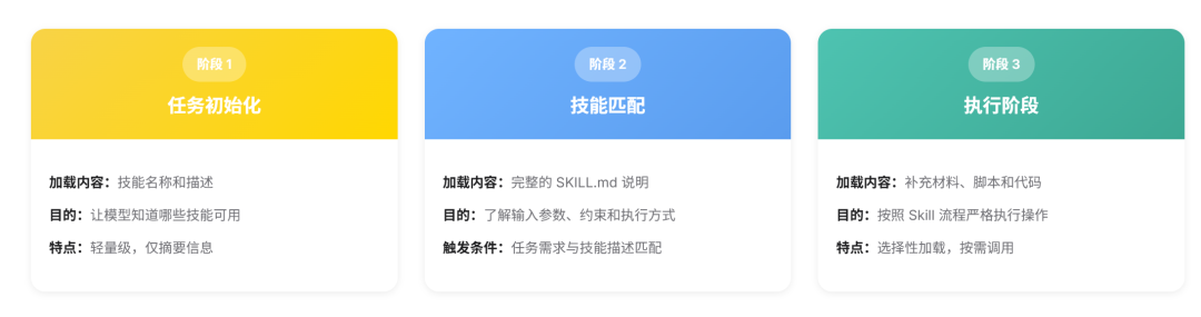- 在智能体启动或任务初始化阶段,模型仅会加载每个可用技能的名称和描述,让模型知道该技能何时可能相关。