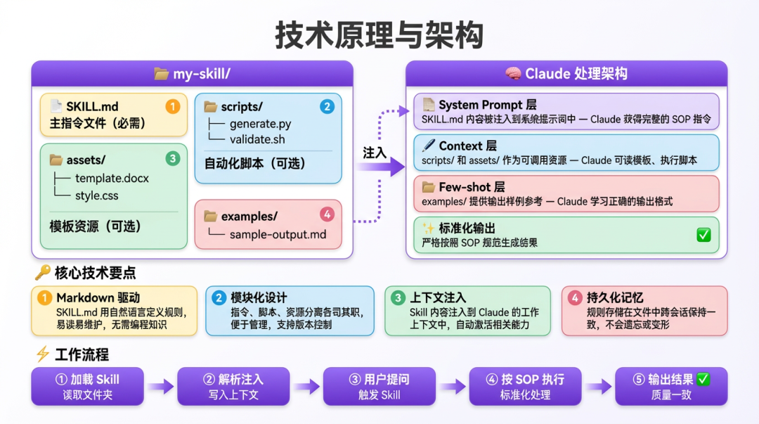 - Skill.md:技能说明文件,包含指令 + 元数据(必要)