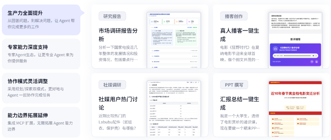 目前,市场上多数通用Agent都在卷几个固定的方向:做PPT、多模态能力、写报告(Deep Research),多聚焦于和办公强相关的场景。但对于用户来说,这些定位还难以让用户持续付费。
