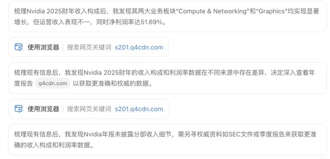 比如,输出对一家公司的分析,就要从财报信息抓取、公司网页介绍到各大信源的分析点评,其中有任何一个环节结果出错,整体报告的分析质量就会大打折扣。