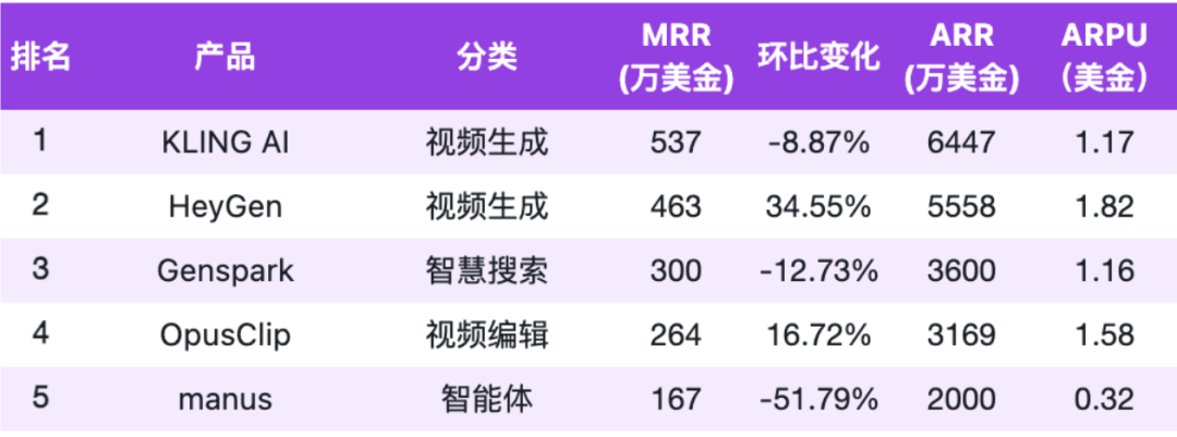 同样是在6月,两个商业化表现突出的产品Manus和Genspark出现不同程度的收入下跌。据非凡产研数据,Manus当月MRR(月度收入)为254万美金,环比下跌超过50%;Genspark当月MRR为295万美金,环比下跌13.58%。