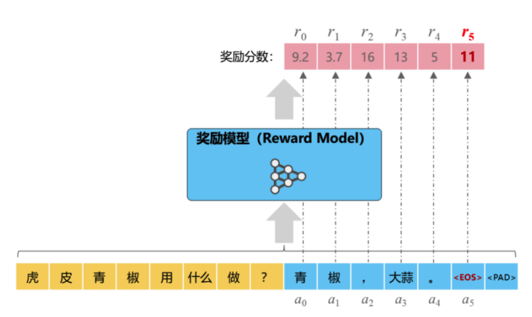 如图所示,每个回答产生一个对应的奖励分数,如 r₀=9.2、r₅=11 等。