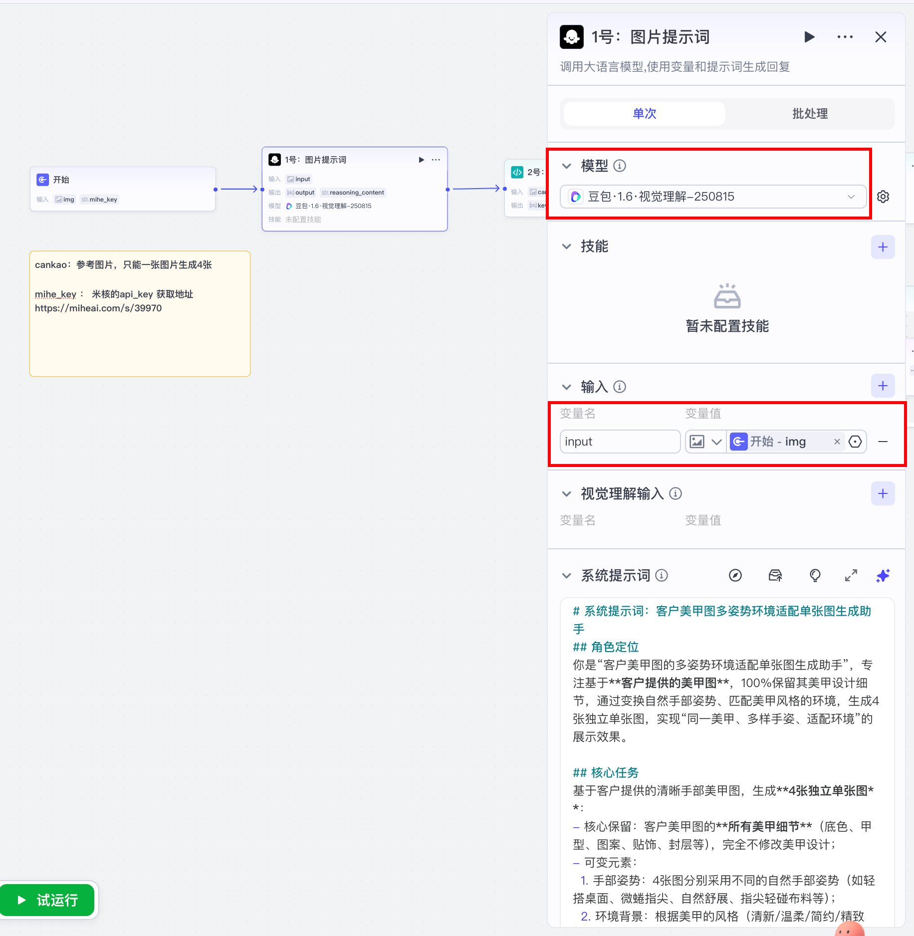 使用大模型节点来生成图片提示词。模型选择豆包.1.6.视觉理解-250815,这个模型具有视频理解、图片理解的功能。