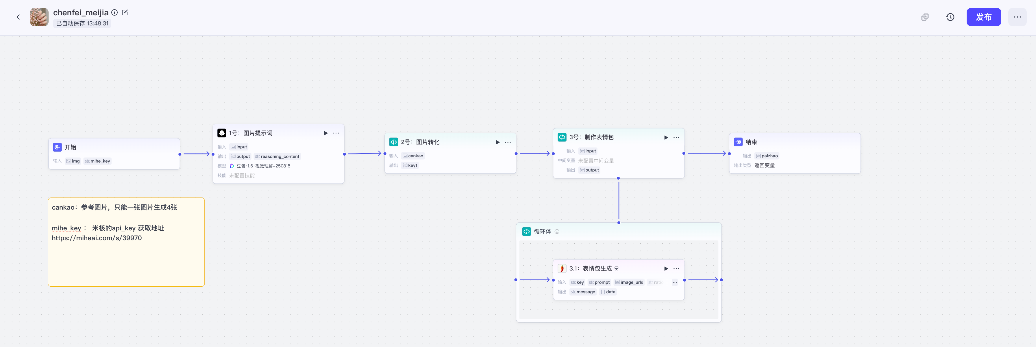使用【循环】节点来依次生成图片。使用【na2图片生成】插件生成图片,配置如下,key选择开始节点传入的mihe_key。比例选横屏3:4,分辨率为2K。