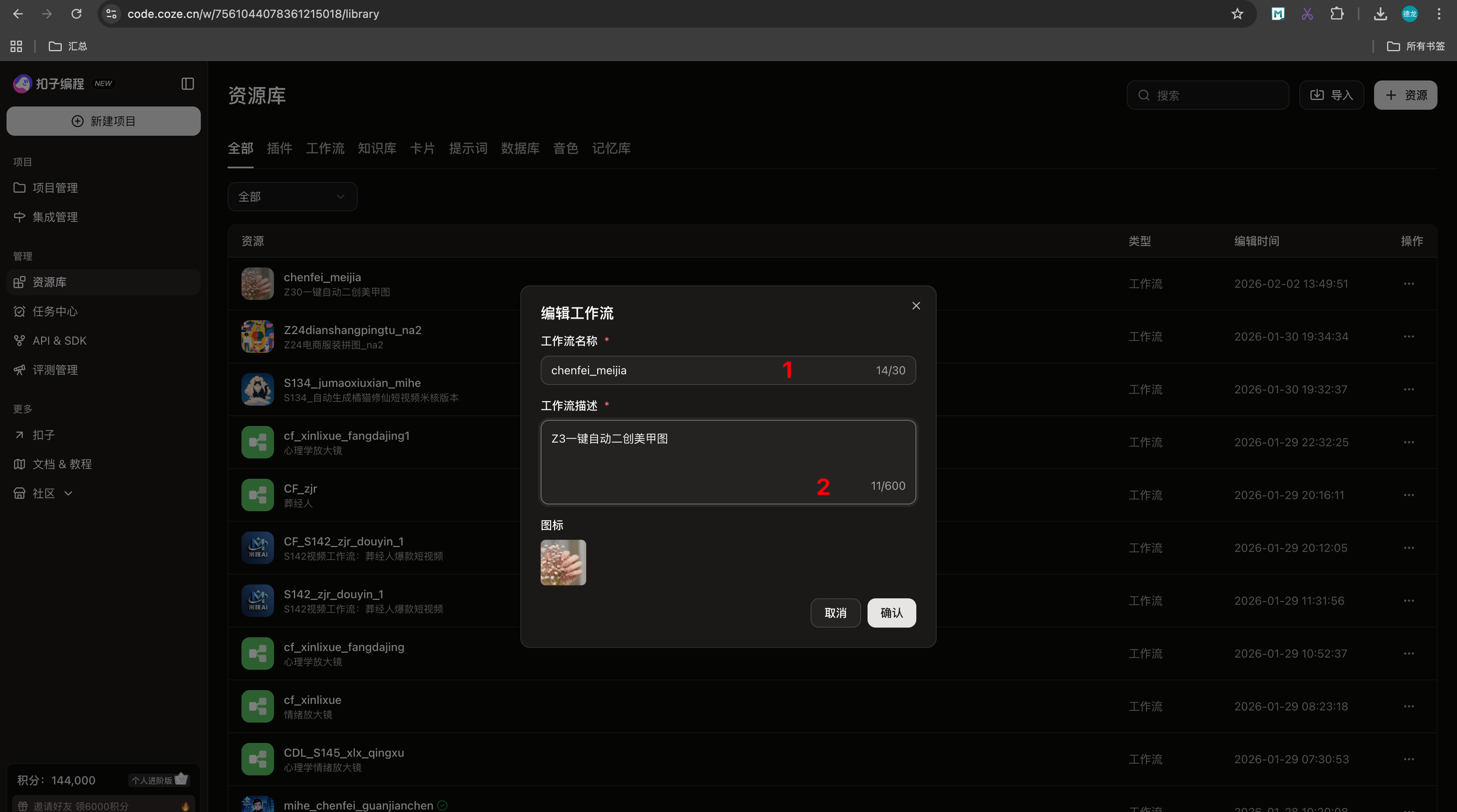 2、点击 “扣子编程->个人空间 ->资源库-> 资源->工作流”