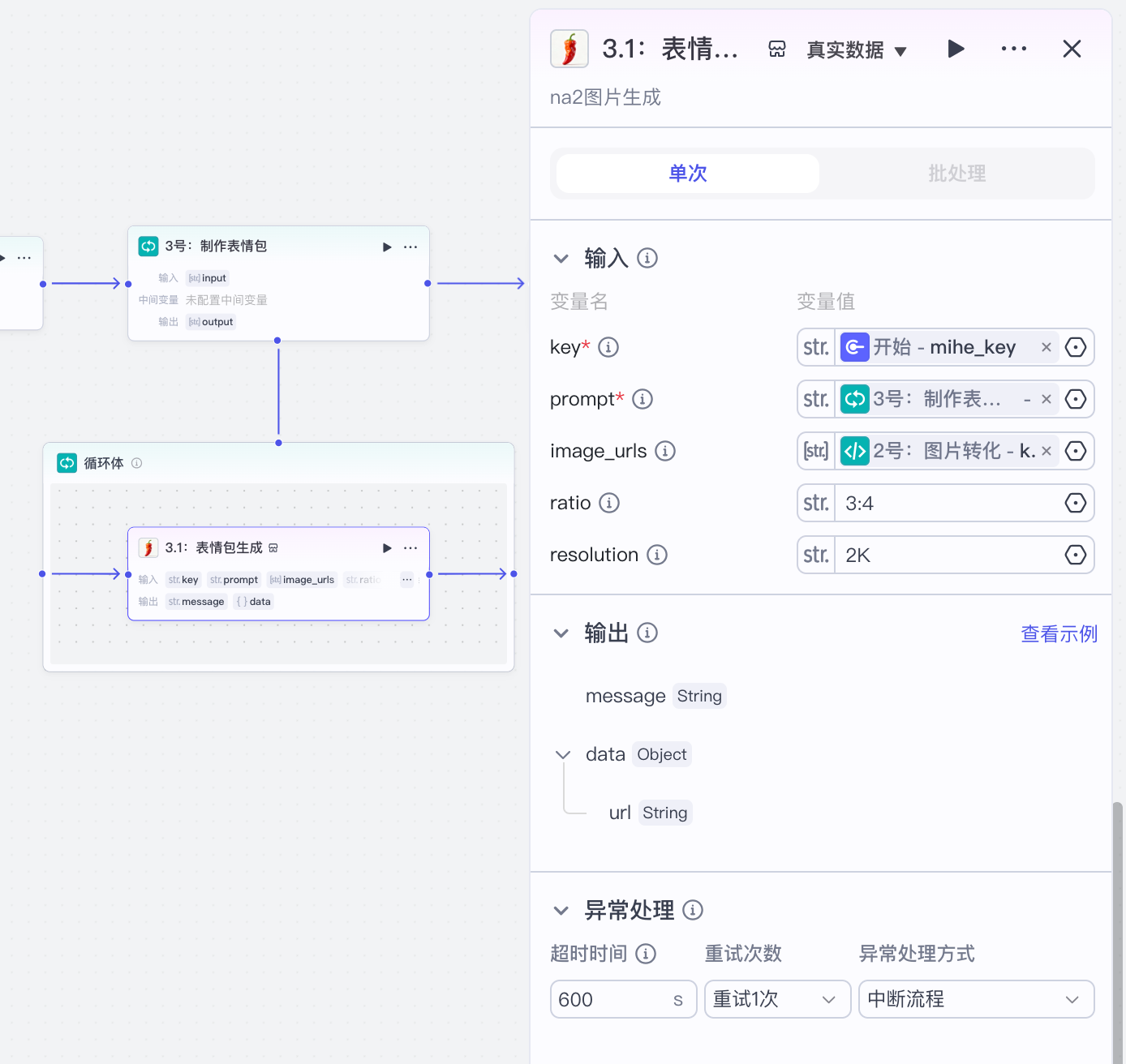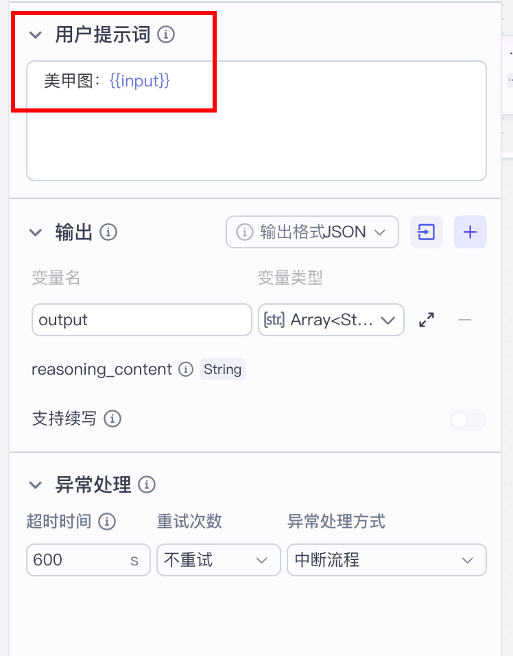 用户提示词,输出和异常处理的设置: