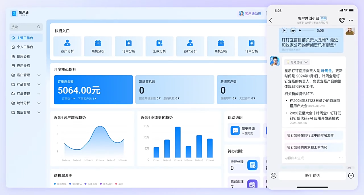 钉钉生态联动优势 依托阿里钉钉生态,宜搭可与钉钉办公场景深度融合,实现应用嵌入钉钉工作台、钉钉消息推送等功能,无需额外下载APP,企业员工可直接通过钉钉使用搭建的应用,大幅降低推广与使用成本。