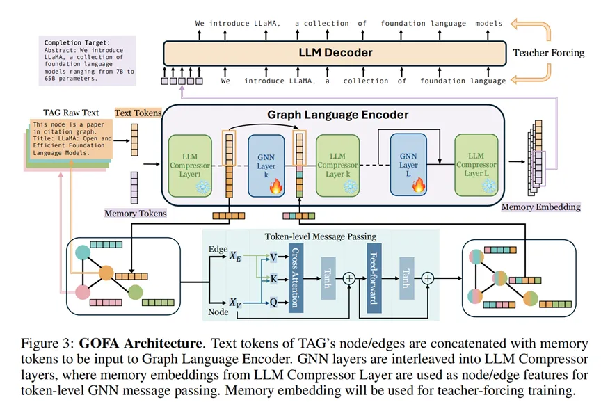 首先,图节点的文本往往极长,如果把邻居节点的文本全部拼接起来,Context Window 瞬间就会被撑爆。GOFA 借鉴了 ICAE (In-Context Auto-Encoder) 的思想,利用 LLM 的浅层作为“压缩器”,将每个节点的长文本压缩为 K 个固定的 Memory Tokens 。这种方法既保留了核心语义,又把长度压到了可接受的范围。除此之外,GOFA 使用了一种“三明治架构”,它并没有把 GNN 放在 LLM 外面,而是将其插入到了 LLM 的层与层之间。Layer i (LLM):处理语义,提取 Memory Tokens。Layer i+1 (GNN):在 Memory Tokens 之间交换信息,进行消息传递(Message Passing)。Layer i+2 (LLM):基于交换后的信息继续进行深层语义推理。这种设计让“结构信息”与“语义信息”在模型内部进行了多轮握手。LLM 每思考一层,GNN 就帮它在图结构间传播,从而实现了真正的模态对齐。