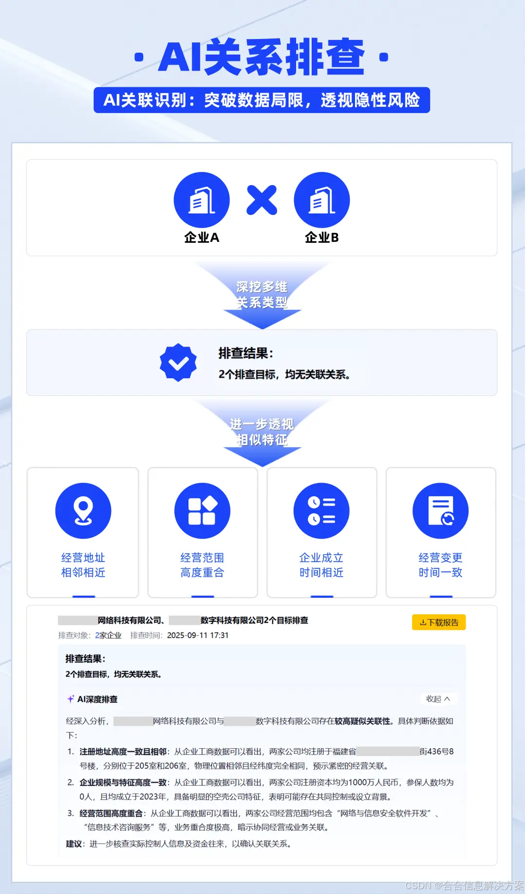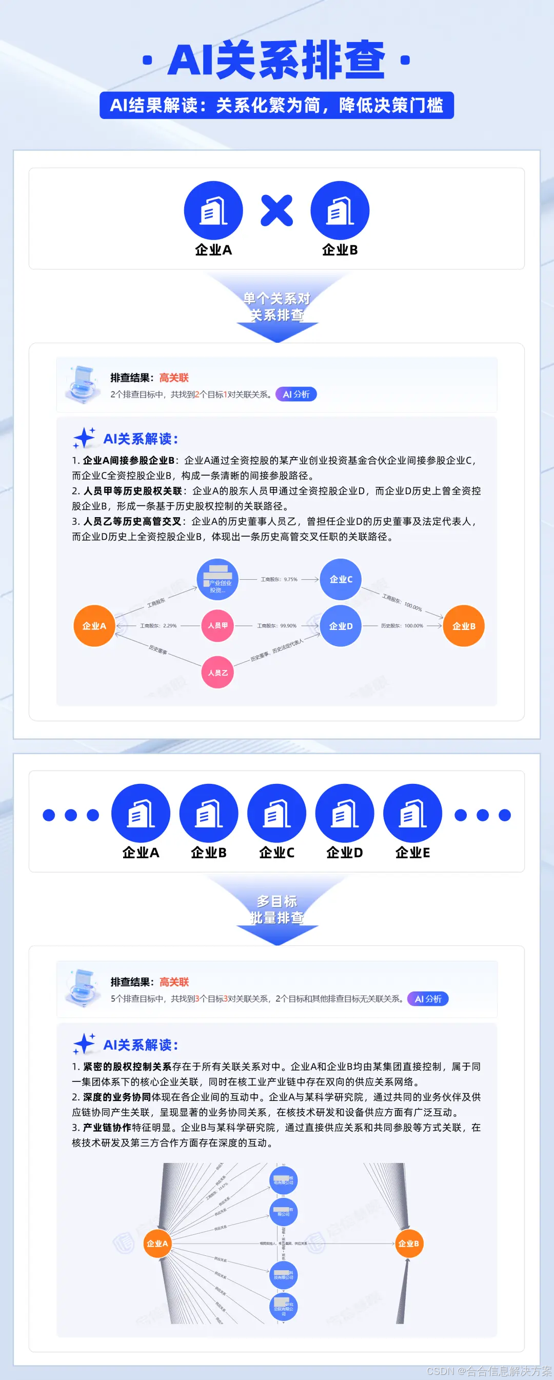 第四步,结果解读与决策落地。功能自动对排查结果进行智能总结与清晰解读,针对单个关系对呈现明确的关联路径,辅助工作人员快速判断风险等级;针对复杂多层级关系链路,梳理清晰关联逻辑,明确企业间关联程度,并提供批量排查场景下的相应处置建议,降低决策理解门槛,助力企业快速落地排查结果、防范合规风险。