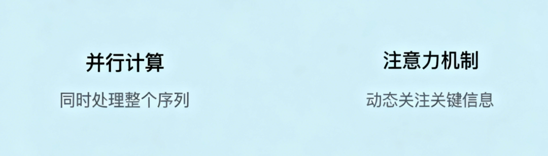 - 核心创新:“并行计算 + 注意力机制”—— 不用逐字处理,能同时分析多个关键词,还能记住词与词的关系,又快又准。